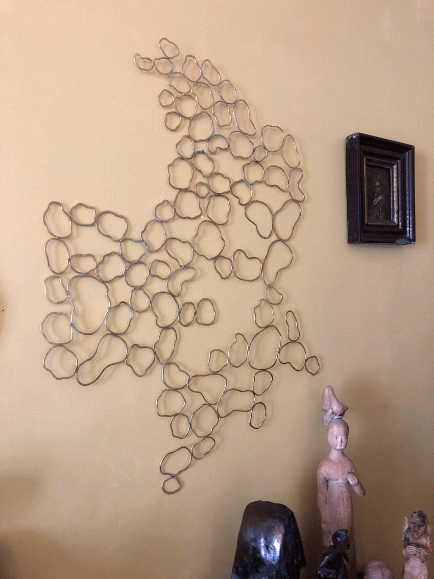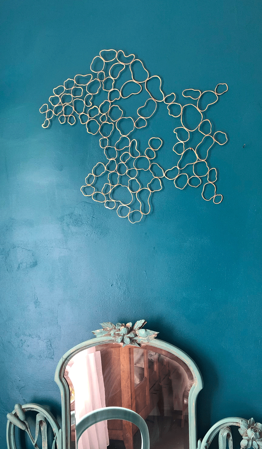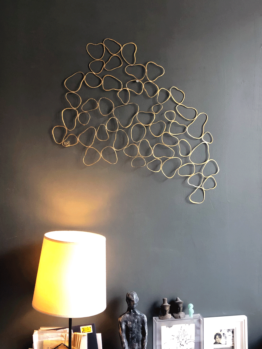 Les bulles sont des créations en fil de laiton martelé, chaque nuage est unique , il peut se suspendre dans les airs ou se suspendre à votre mur. Chaque nuage est d’environ 50 cm sur 50 cm et peut s’acheter à l’unité ou s’assembler l’un avec l’autre.
